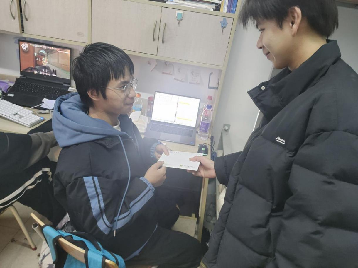 活动前期,同学们踊跃参与,用温暖的笔触写下对不懈努力的考研学子的鼓励与支持,不仅让同学们感受到文学的力量,也给考研学子送去温暖、增添动力。12月13日,一封封匿名信伴着学院领导、老师们精心准备的“考研加油礼包”发放到每一位考研学子的手中。考研学子孙楠在收到匿名信后给学生会权益邮箱留言:“最近考研的压力比较大,但读到这封信后,心里就像有一股暖流在徜徉,很温暖,感谢学弟学妹的鼓励!”