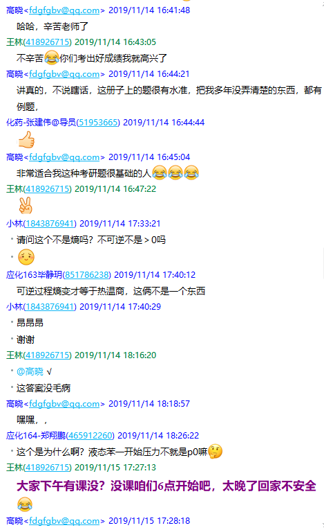 本人在执教物理化学的十余年间,一直关注学生考研情况,坚持每年义务辅导有考研需要的学生,帮助他们选择专业和备考,有着丰富的经验。近5年来,物理化学在研究生入学考试中所占的比重越来越大,因此越发受到学校和学院的重视。为此,本人于2019年联合了兰州大学、吉林大学、东北师范大学、陕西师范大学、长安大学等五所名校的几位一线教师,将《物理化学》中的重点、难点、考点问题以及大量学习资源进行分类整合,编纂了一本《<物理化学>类型题训练及解析》,作为我校学生的考研辅导材料,并利用业余时间在线下集中辅导考研学生,讲解难题、传授答题技巧。同年底,应用化学2016级本科生考研通过率显著提高,学生普遍认为这次集中辅导的作用非常大(图6)。在本人的悉心辅导下,在课题组做毕业设计的5位本科生全部都考上了一流高校和科研院所(吉林大学、同济大学、中科院长春应化所)。
