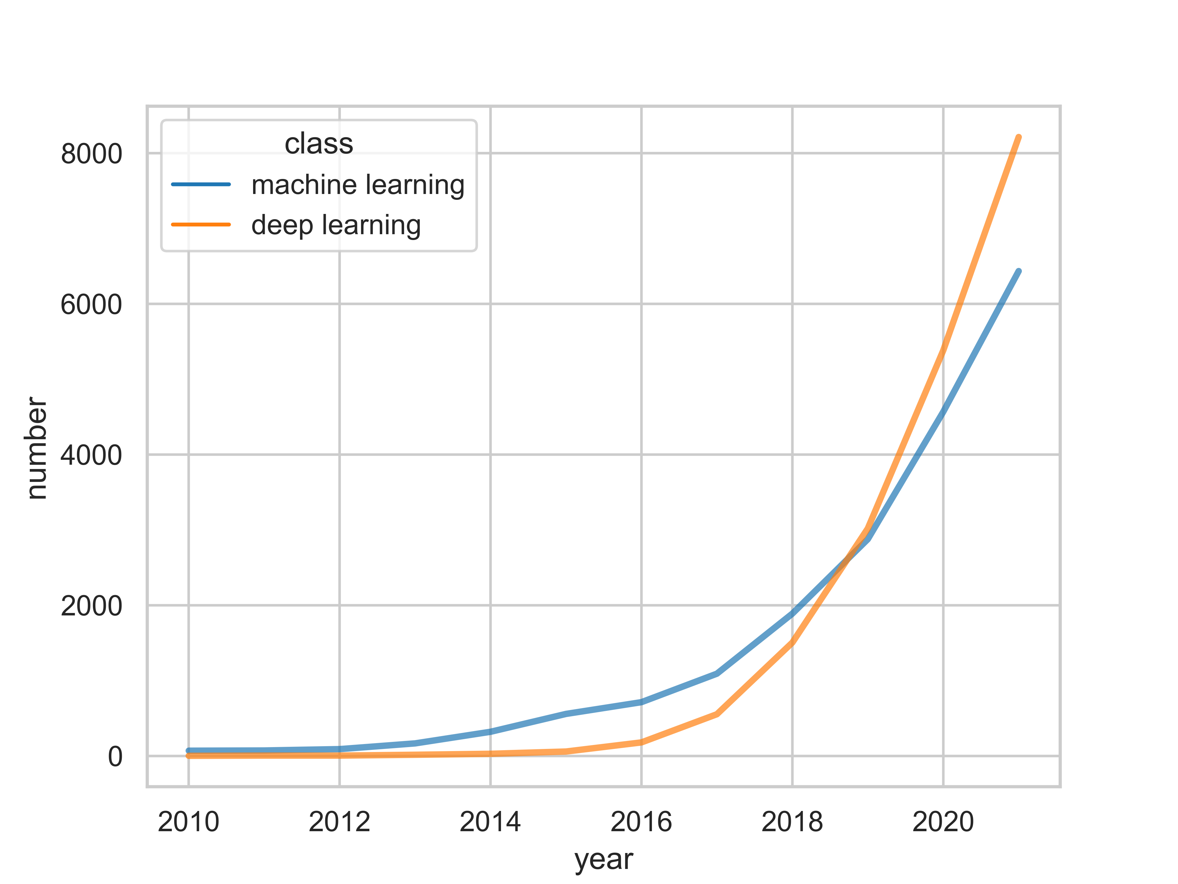 图 1. 机器学习(machine learning)和深度学习(deep learning)研究增长趋势。数据来源于SCIFinder数据库