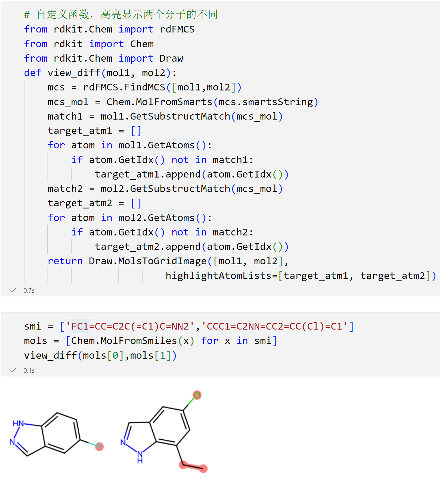图 2. 示例代码及化学数据可视化(这段代码用于查找给定两分子的不同之处)
