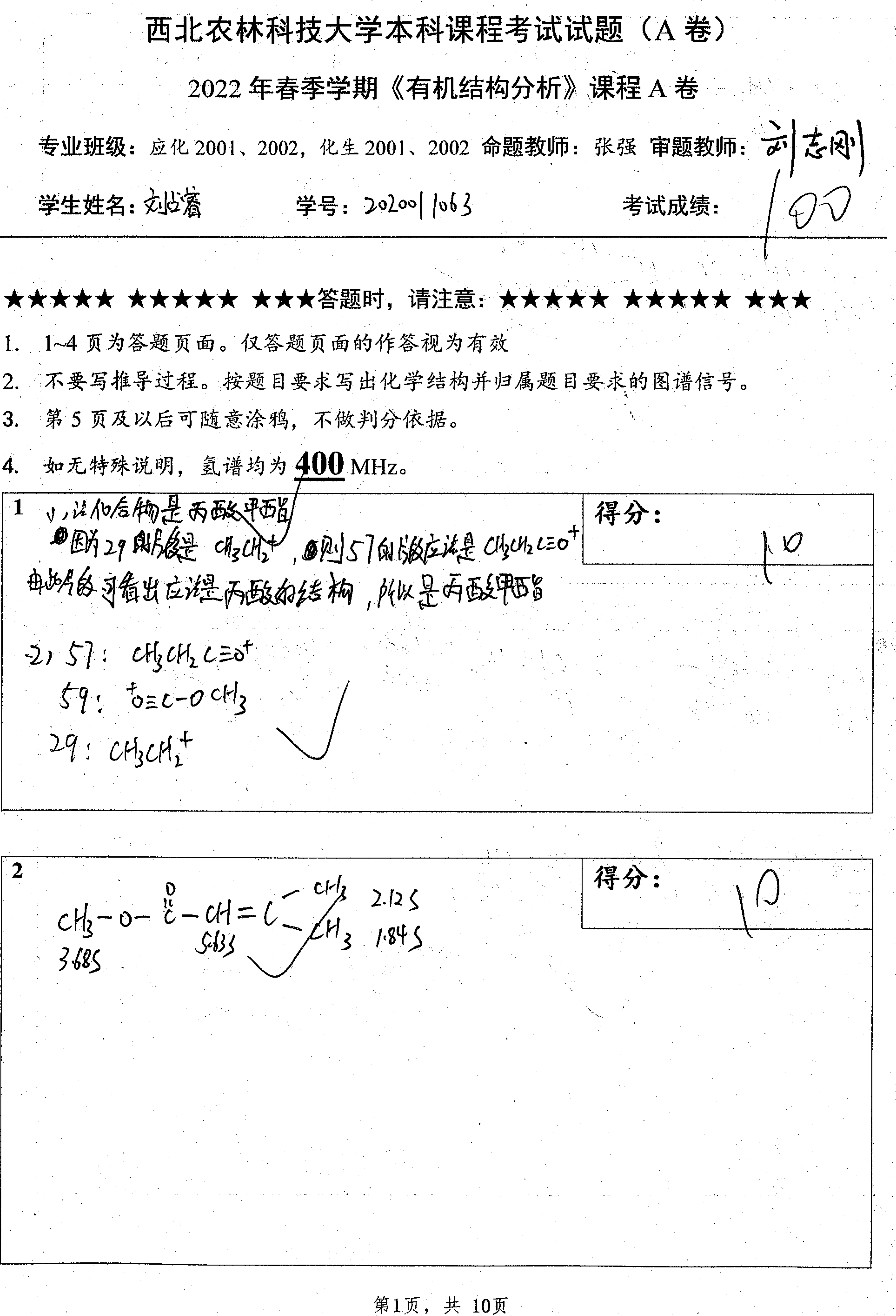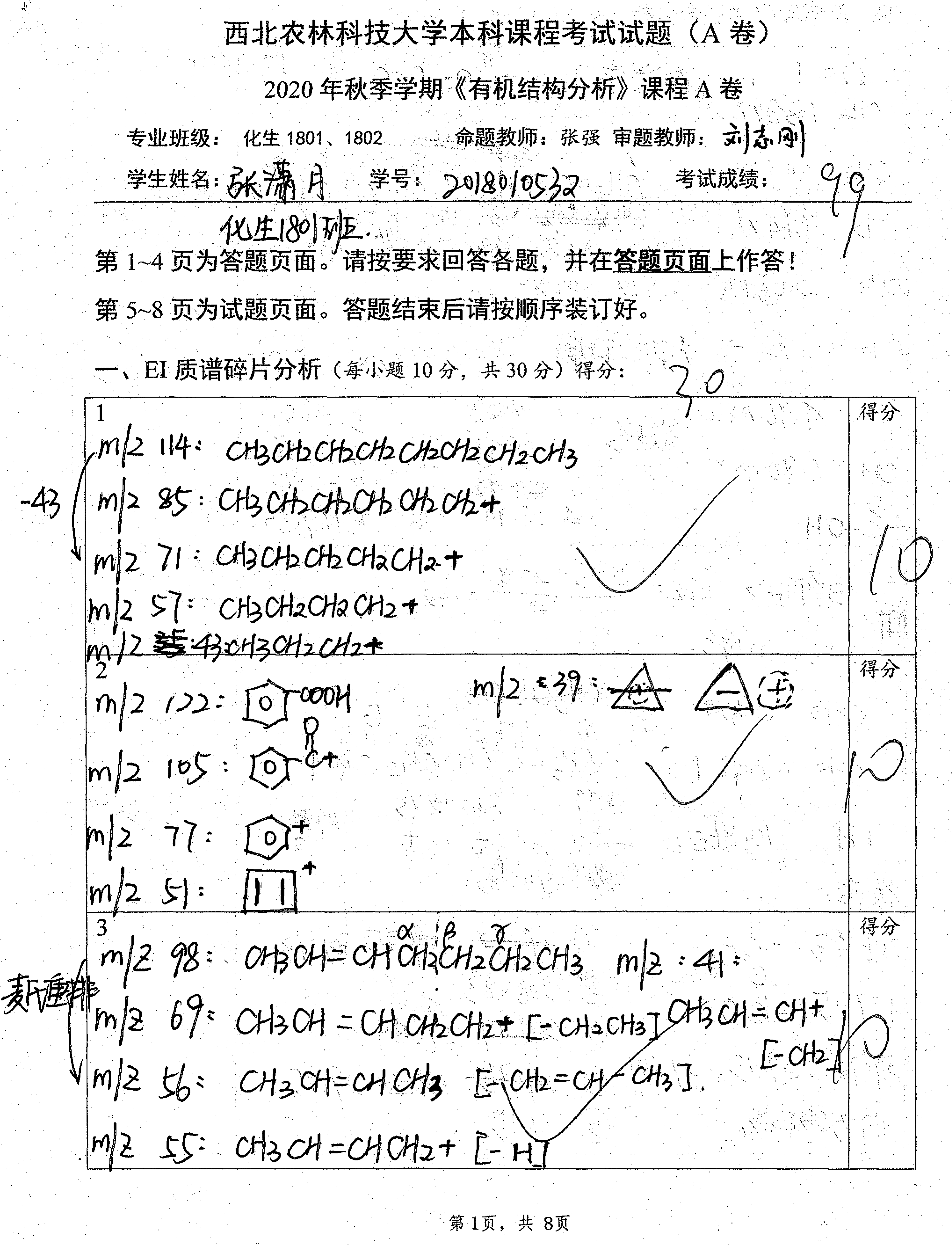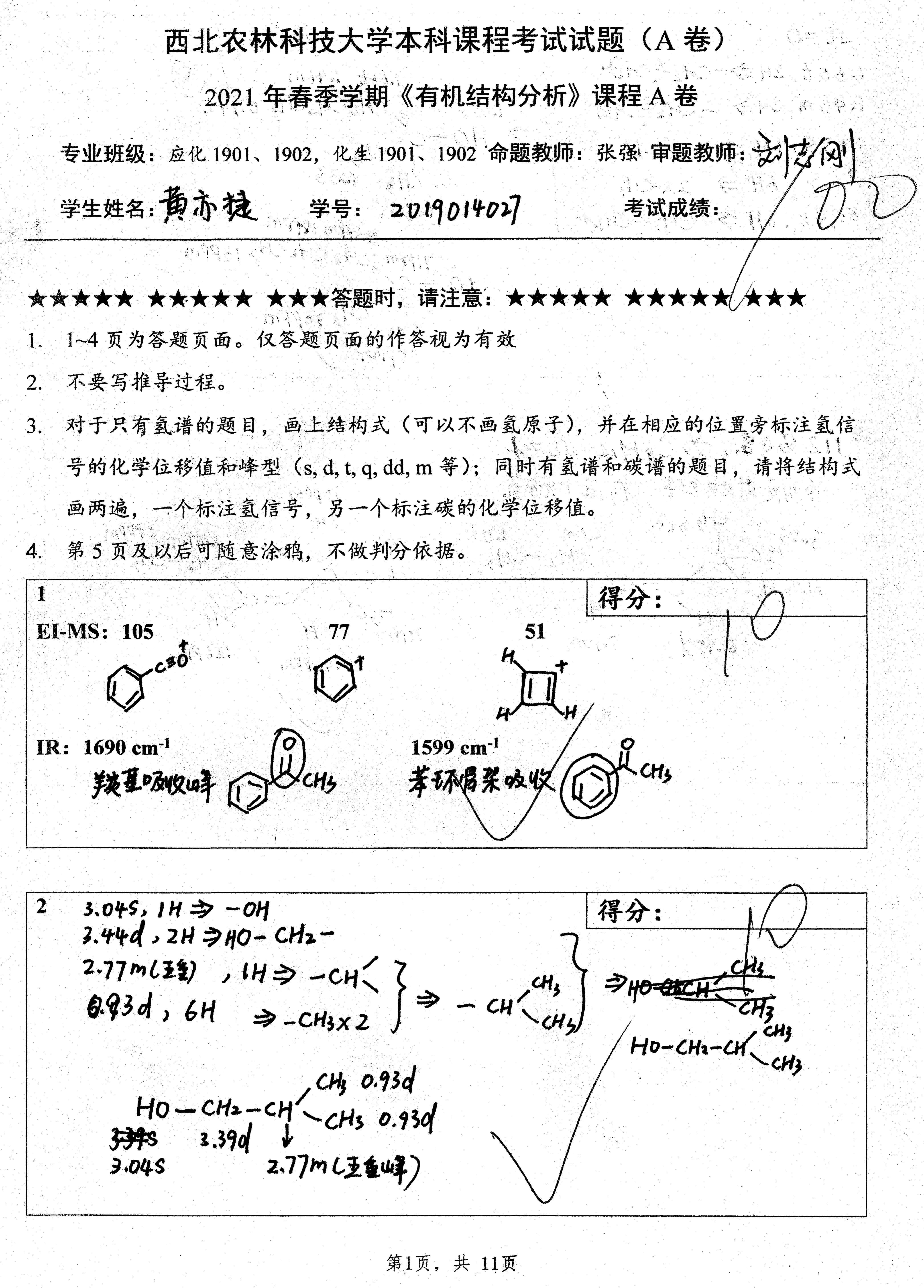 课程的核心任务是培养学生的有机图谱分析能力。考试题目也同样紧紧围绕能力考核开展。自2019年以来,考试题目类型抛弃了选择题、填空题和问答题,而全部改为以图谱分析能力考核为目的的图谱分析题,强化能力考核而非知识点考核,重在考查学生运用知识解决实际问题的能力。