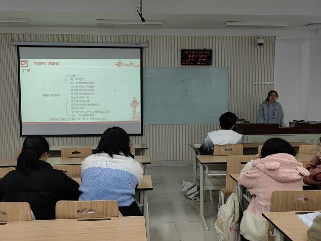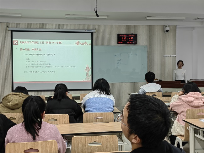 本科生2支部党员赵冬梅、杨孙莹分别就“为什么加入中国共产党”和“入党流程”进行了深入的讲解。首先,赵冬梅带领化学类2203团支部共同学习党的二十大报告中中国共产党推进思想理论建设特别是新时代理论创新的宝贵经验和重大成果,以及党的二十大审议修订的《中国共产党章程》,并与化学类2203班全体学生探讨为什么要加入中国共产党这一话题,着重强调“为实现共产主义、更好的为人民服务而入党”才是端正的入党动机。随后,杨孙莹对入党程序和流程进行讲解,并点明入党申请书的基本书写格式、书写中应注意的问题以及如何写思想汇报。她指出从申请人到正式党员是一个大浪淘沙的过程,“千淘万漉虽辛苦,吹尽黄沙始到金。”只有具有最端正的入党动机、最坚定的信念、最坚强的意志,时刻不忘入党初心,牢记自己的使命的同学才能最终被吸纳进党组织。