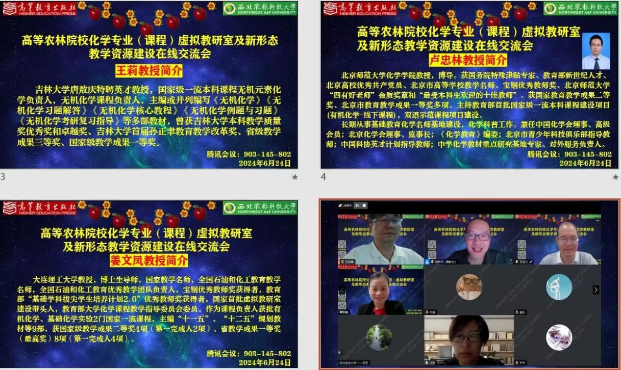 为深入贯彻2024年全国教育工作会议精神,推动教育数字化战略行动及高等学校高质量教材体系建设,高等农林院校化学专业(课程)虚拟教研室及新形态教学资源建设在线交流会于2024年6月24日召开。本次专题研讨会由高等教育出版社郭新华编审和91JAV 王俊儒教授共同主持,来自全国20余所高校的院长、虚拟教研室负责人、一线教师等近百人参会。学院院长王进义教授致辞。他指出,去年年初至今连续举办的十余场次全国性系列课程研讨会对于推动新时期高等农林院校化学专业(课程)建设具有重要意义。