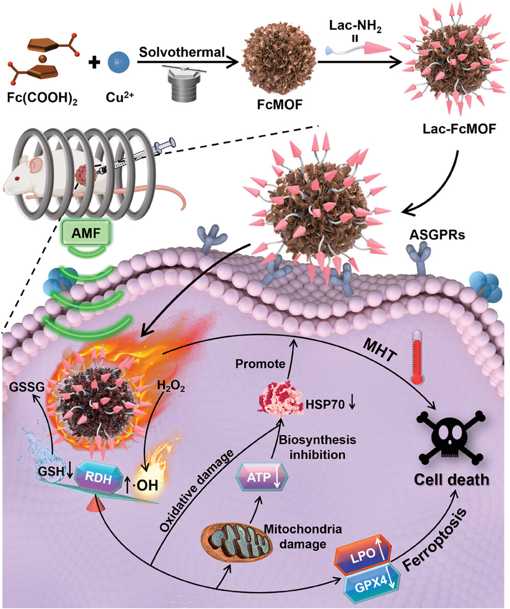 温和磁热疗法(MMHT)在治疗深层肿瘤方面具有巨大潜力,但治疗过程中热休克蛋白(HSPs)的上调阻碍了其治疗效果。鉴于此,该团队研究开发了一种乳糖修饰的新型顺磁性金属有机框架(Lac-FcMOF)材料,其作为磁热剂可通过加剧双向氧化还原稳态失衡(RDH)增强温和磁热疗法的抗肿瘤疗效。研究表明,该顺磁性金属有机框架材料通过磁热加速铁离子介导的谷胱甘肽消耗和亚铁离子催化的羟基自由基生成来引起双向氧化还原稳态失衡,从诱导热休克蛋白70HSP70)的氧化损伤和合成抑制、并且引起细胞铁死亡,显著增强了温和磁热疗法的治疗效果。该团队开发的顺磁性金属有机框架材料为简单构建磁热剂用于肿瘤温和磁热疗法提供了新的策略。