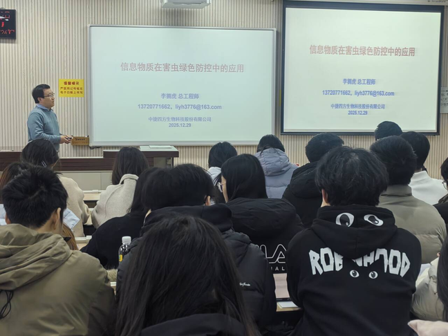 行业领航,拓宽专业视野。12月29日,学院邀请两家实习单位的资深专家进校作行业专题报告。上午,陕西农业发展集团有限公司的工程师郭园超分享《植物保护与农药的关联应用与案例解析》。他剖析了化学农药在农业生产中的作用,围绕农药施用的“3R”问题展开探讨,让同学们清晰认识农药产业的现状与发展方向。下午,中捷四方生物科技股份有限公司总工程师李拥虎以《信息物质在害虫绿色防控中的应用》为题,讲解昆虫信息素的作用原理,并结合产品开发与田间应用实例,展示该技术在农业绿色发展中的潜力。两位行业专家的报告内容翔实、案例生动,让同学们对实习领域有了直观且深刻的认知。